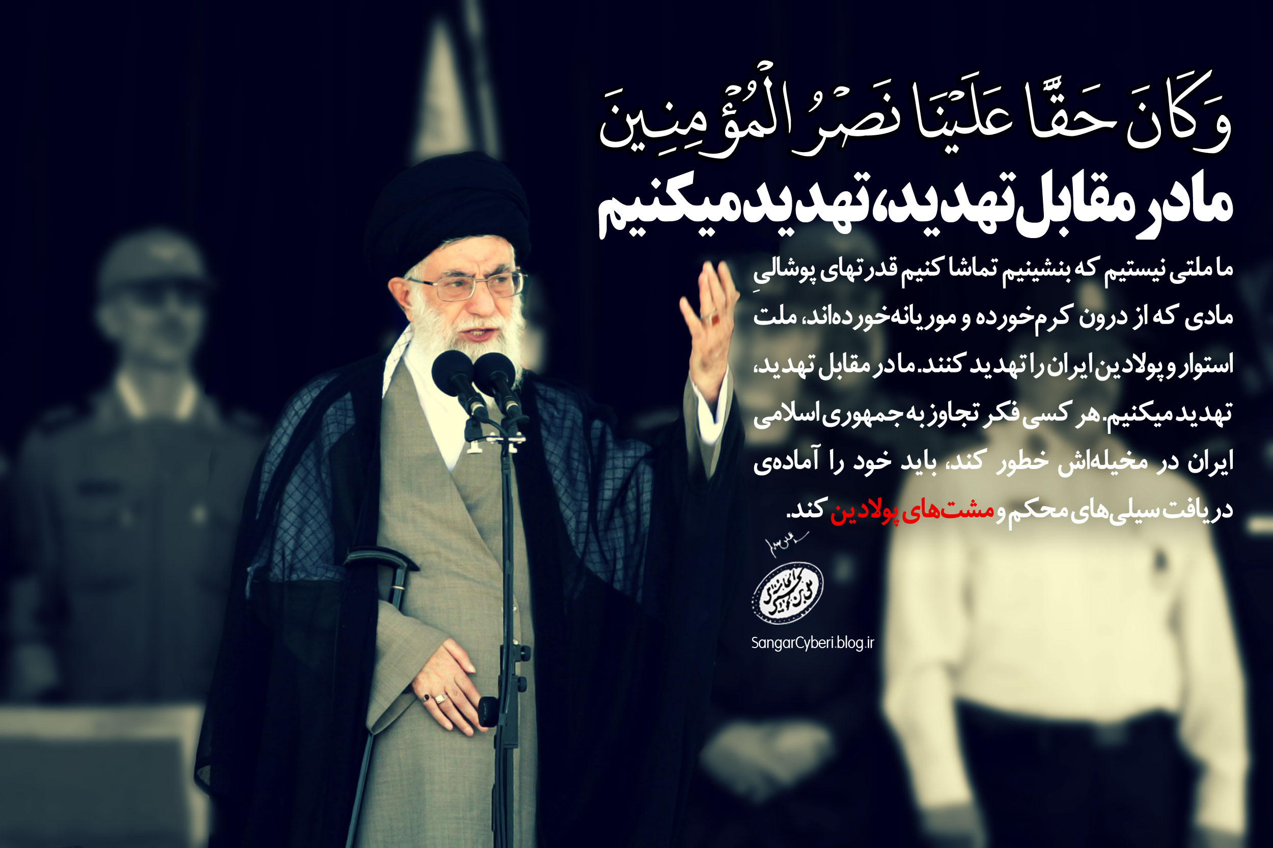 ما مظلومین همیشه تاریخ، محرومان و پابرهنگانیم ما غیر از خدا کسی را نداریم و اگر هزار بار قطعه قطعه شویم دست از مبارزه با ظالم بر نمی داریم. بغض و کینه انقلابی تان را در سینه ها نگاه دارید با غضب و خشم بر دشمنان بنگرید و بدانید که پیروزی از آن شما است.